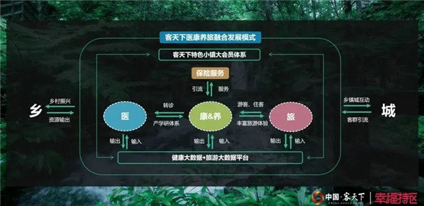 客天下医康养旅融合发展模式就是客天下将依托现有康养产业发展基础,加强特色项目之间的联动,围绕小镇资源条件,进一步延伸“康”与“养”产业链条, 向上对接“医”与“保”资源,充分发挥“旅”与“医、康、养”三大领域的价值衔接,打通“大健康+旅游”大数据平台的对接,实现“医康养旅”融合发展的创新实践。