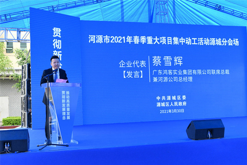 广东鸿客实业集团联席总裁兼河源客天下总经理蔡雪辉作为企业代表致辞。蔡雪辉总裁首先对河源市委、市政府和源城区委、区政府及社会各界朋友一直以来对客天下事业发展的关心和支持表示诚挚感谢,作为连续6年入选广东省重点项目,客天下坚定围绕“生态河源、现代河源”发展战略,紧跟“融深”、“融湾”发展步伐,与源城区在“新型城镇化、特色小镇、乡村振兴”等方面同频共振。2021年,客天下将继续秉承工匠精神,充分整合资源、发挥产业赋能客天下在文化旅游、健康休闲、生态保护、上市资本的优势,加快推进项目建设,为“两个河源”发展建设作出更大贡献,以优异成绩助力河源实现高质量发展。
